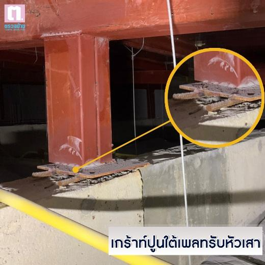 รูโพรงที่อยู่ใต้เพลทหัวเสา ต้องเทปูนอุดส่วนที่อยู่ใต้เพลทให้เต็ม โดยจะใช้ปูนเกราท์ที่เรียกว่า Non-Shrink เพราะปูนชนิดนี้ไม่หดตัว ทำให้เทไปแล้วไม่มีการแตกร้าว ตัวอย่างข้อบกพร่องการเกร้าท์ปูนใต้เพลทไม่เรียบร้อย