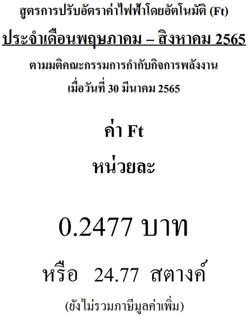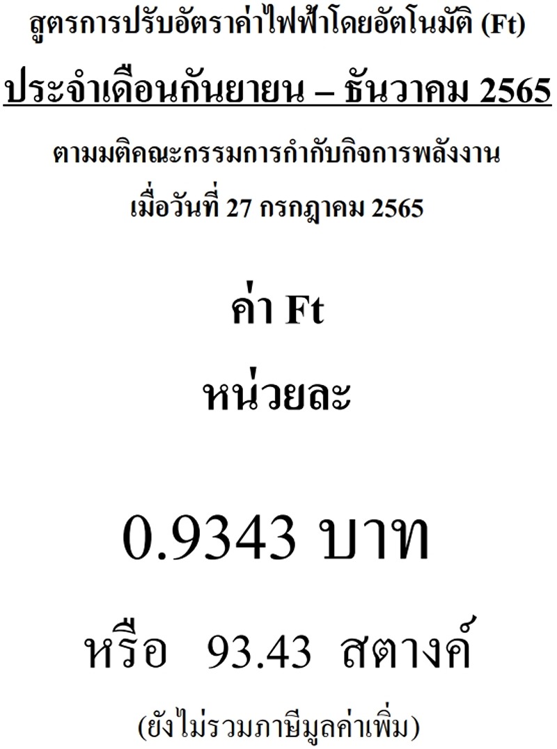 โดยค่า Ft นี้ จะมีการปรับปรุงทุกๆ 4 เดือน ในประเทศไทยจะมีสำนักงานคณะกรรมการกำกับกิจการพลังงาน (กกพ.) ซึ่งจะทำหน้าที่ในการกำกับดูแลกิจการพลังงาน และจะทำหน้าที่ปรับค่าไฟฟ้า ในเดือนพฤษภาคม-สิงหาคม ค่า Ft จะอยู่ที่ 24.77 สต./หน่วย แต่ในส่วนของเดือนกันยายน-ธันวาคม ค่า Ft จะปรับขึ้นเป็น 93.43 สต./หน่วย