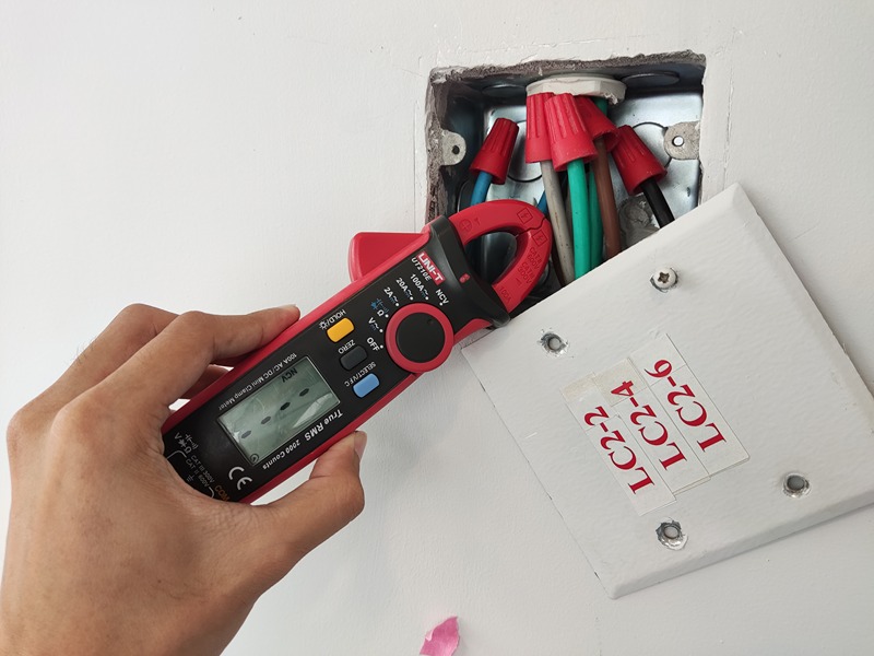 - เช็กขนาดสายไฟเมน เป็นสายที่เดินจากมิเตอร์ไฟฟ้าเข้ามาที่แผงเมนสวิตช์ ใช้ขนาด 2.5 sq.mm. เช็กตู้ MCB ควรใช้ตู้ที่สามารถรองรับกระแสไฟได้สูงสุดไม่เกิน 100 A